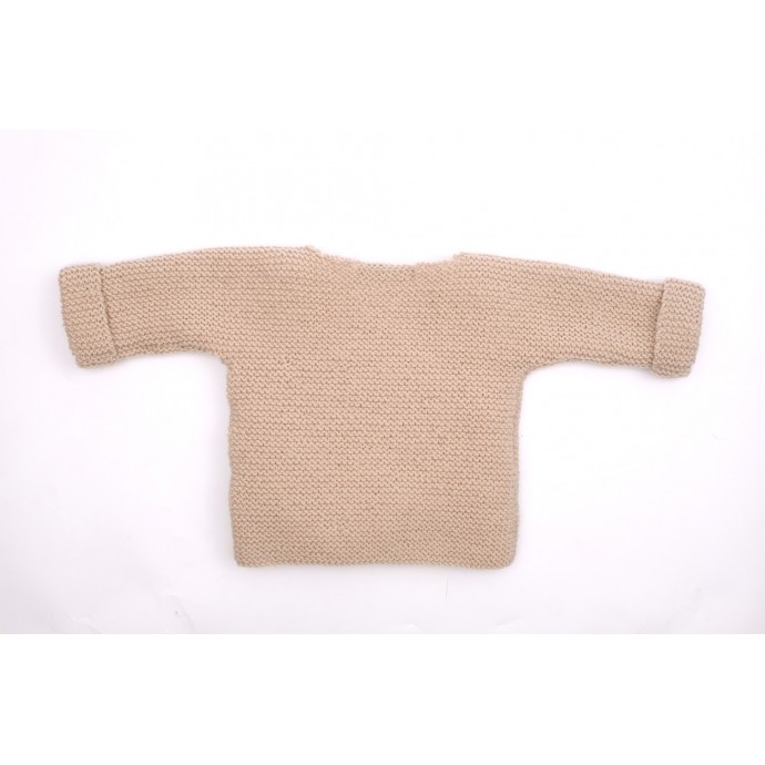 Beige baby cardigan handknitted in garter stich by our French grannies. Made from 100% natural merino wool for a good regulation of bod tempature of the infants. The cardigan wraps around and closes with internal and extarnal cords in order to tailor it to the baby's weight. Ideal for maternity, with almost no seams for maximum comfort of the newborn.