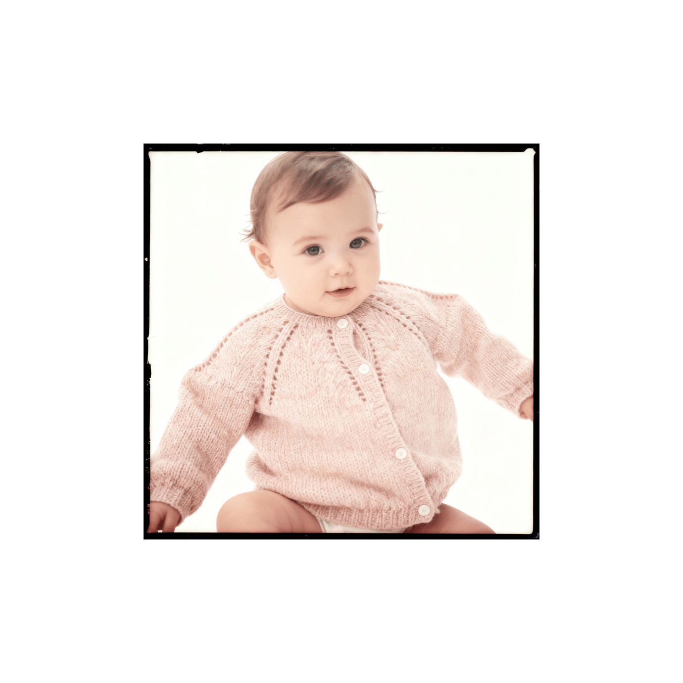 French PDF pattern of this kids cardigan handknitted in garter stitch, old pink.