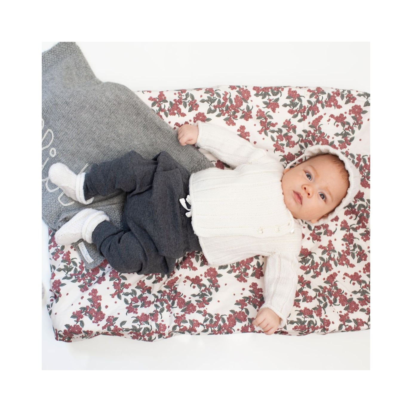 PDF French Pattern for the cardigan for babies, in a light brown color in garter stitch to be made with 00% merino and cashmere, for a good regulation of the newborn's body temperature. The cardigan wraps around and closes with 2 olive tree wooden buttons. Ideal for maternity, with almost no seams for maximum comfort of the baby.