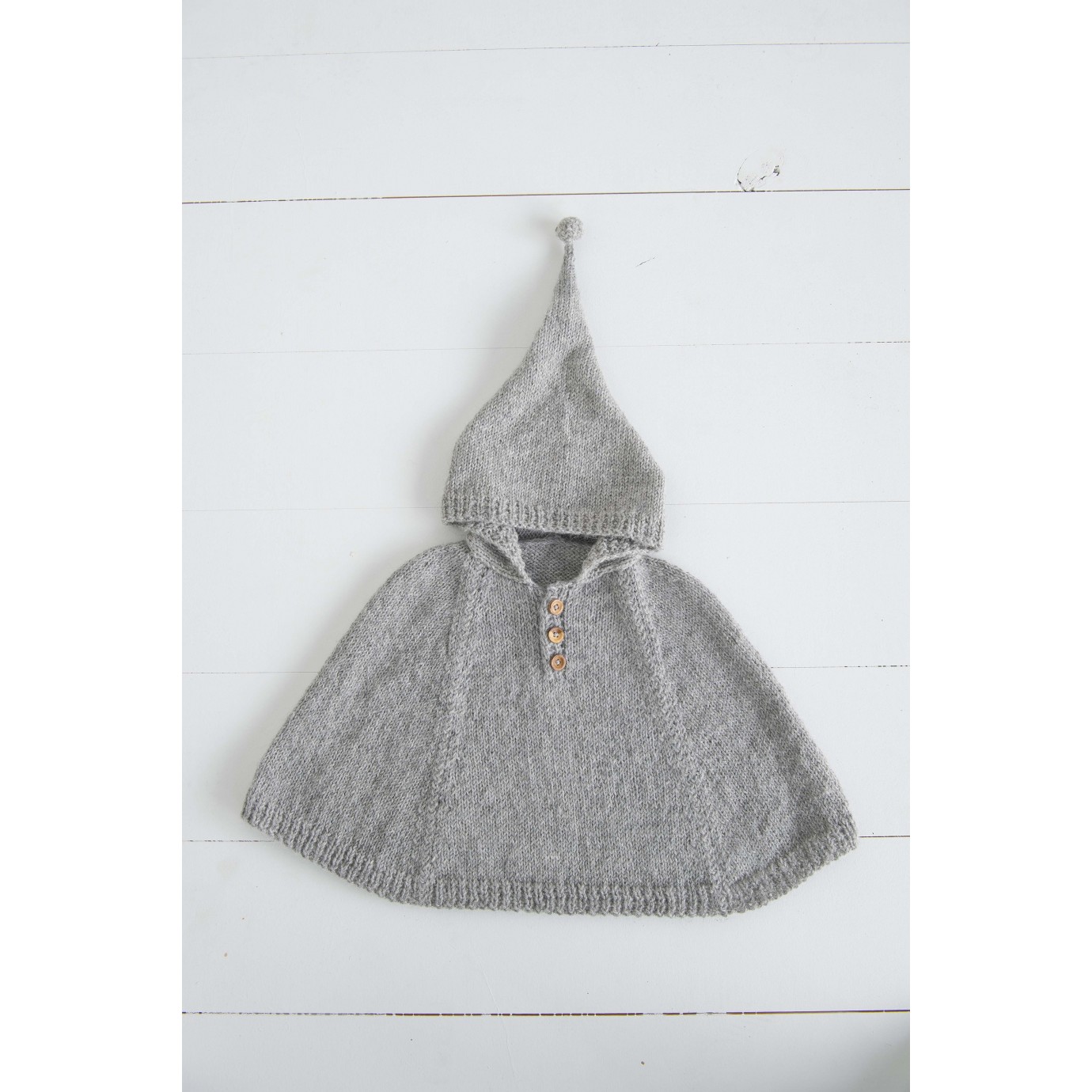 French PDF pattern poncho for babies made from cashmere and camelito yarns, very soft and warm, in a chestnut colour. With three little olive tree wooden buttons at the collar and a pompom at the end of the hood.