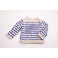 French PDF Pattern of jumper with blue colour stripes for boys. With raglan sleeves closed by three buttons in olive tree wood to make it easier to dress your baby. Knitted by hand in reverse stockinette stich in 100% merino wool.