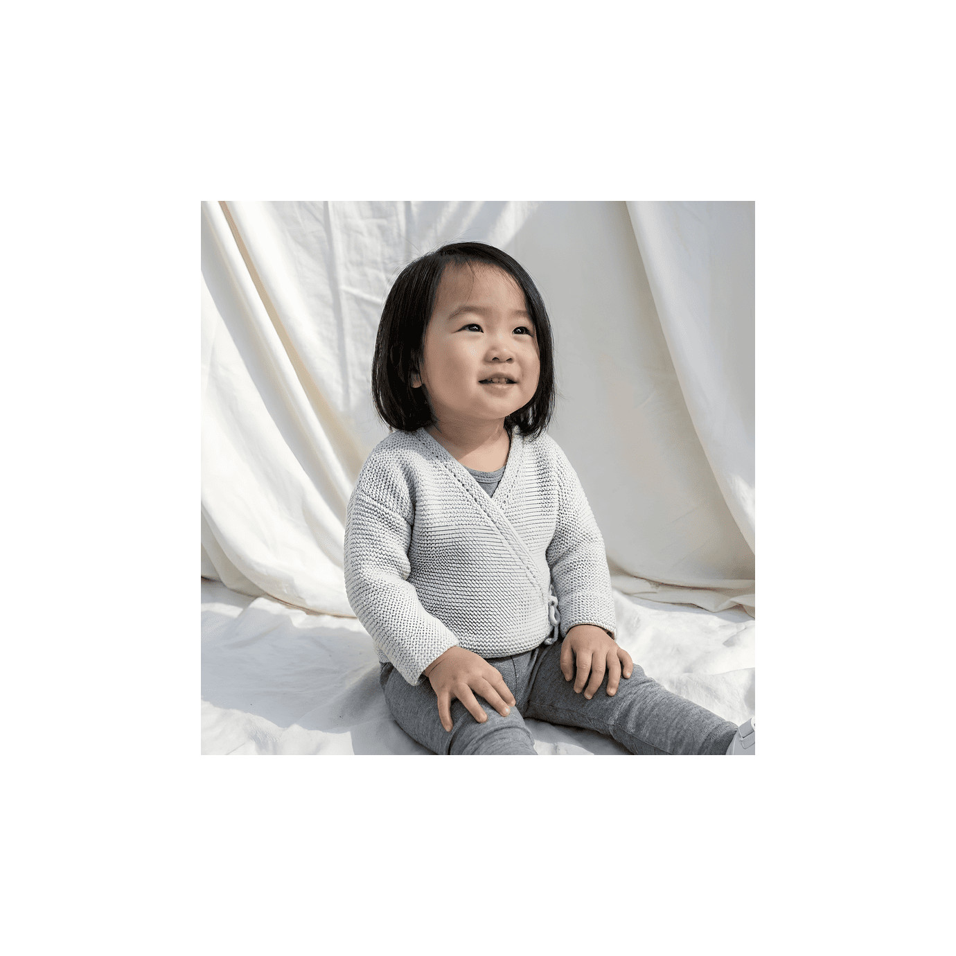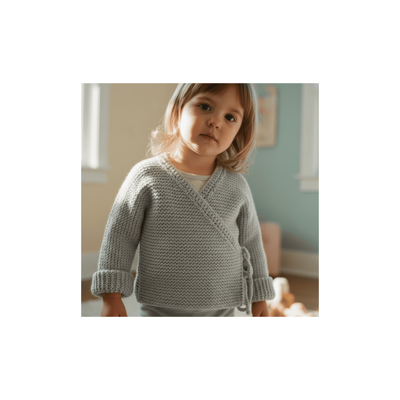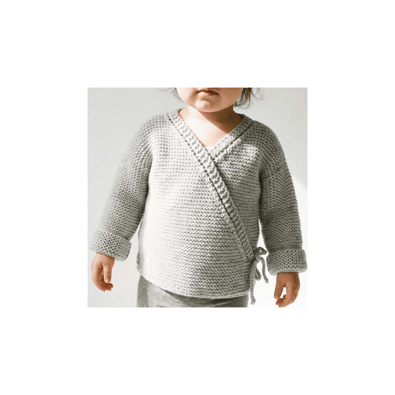 PDF French Pattern for the cardigan for babies, in a light brown color in garter stitch to be made with 100% merino yarn, for a good regulation of the newborn's body temperature. The cardigan wraps around and closes with a nice knot. Ideal for maternity, with almost no seams for maximum comfort of the baby.