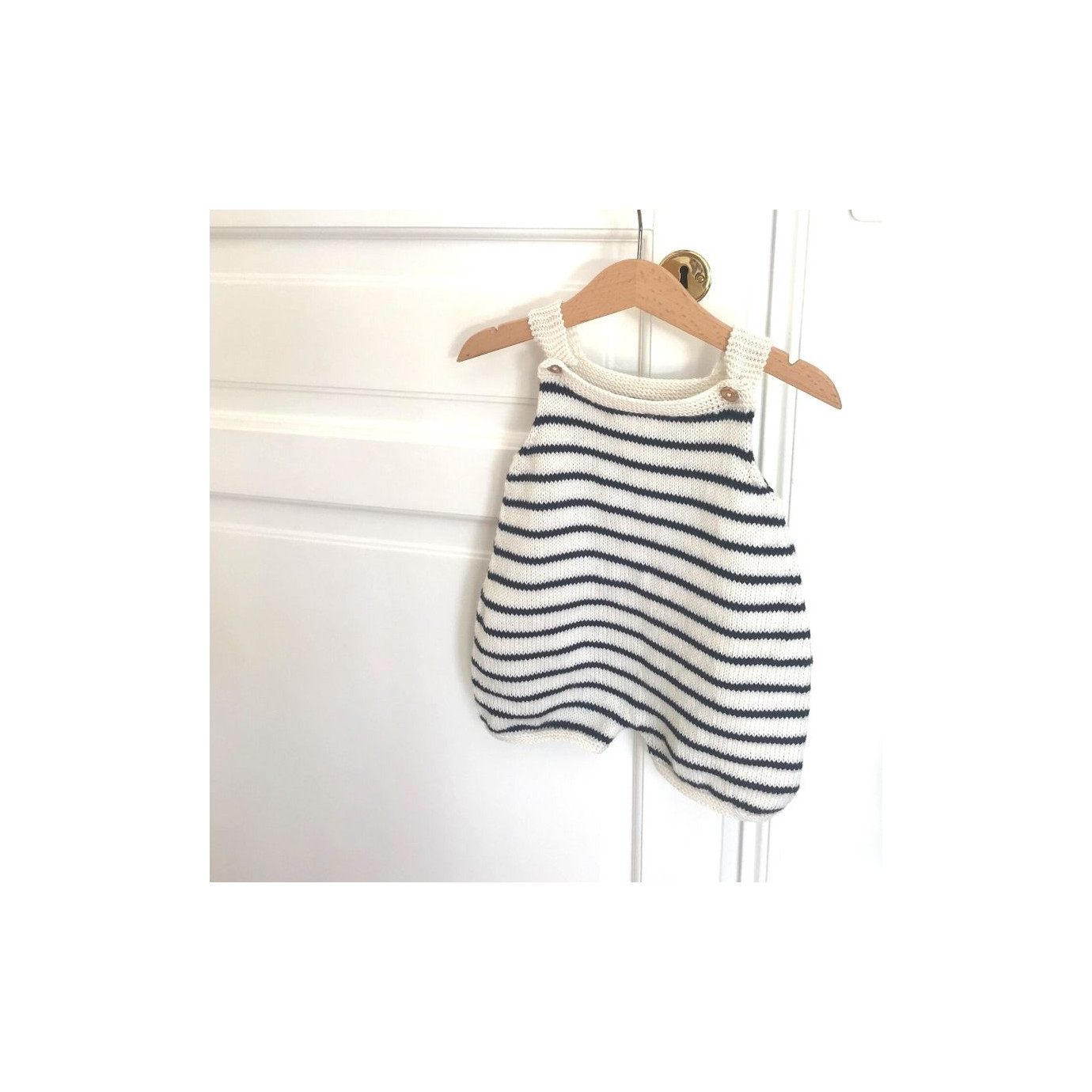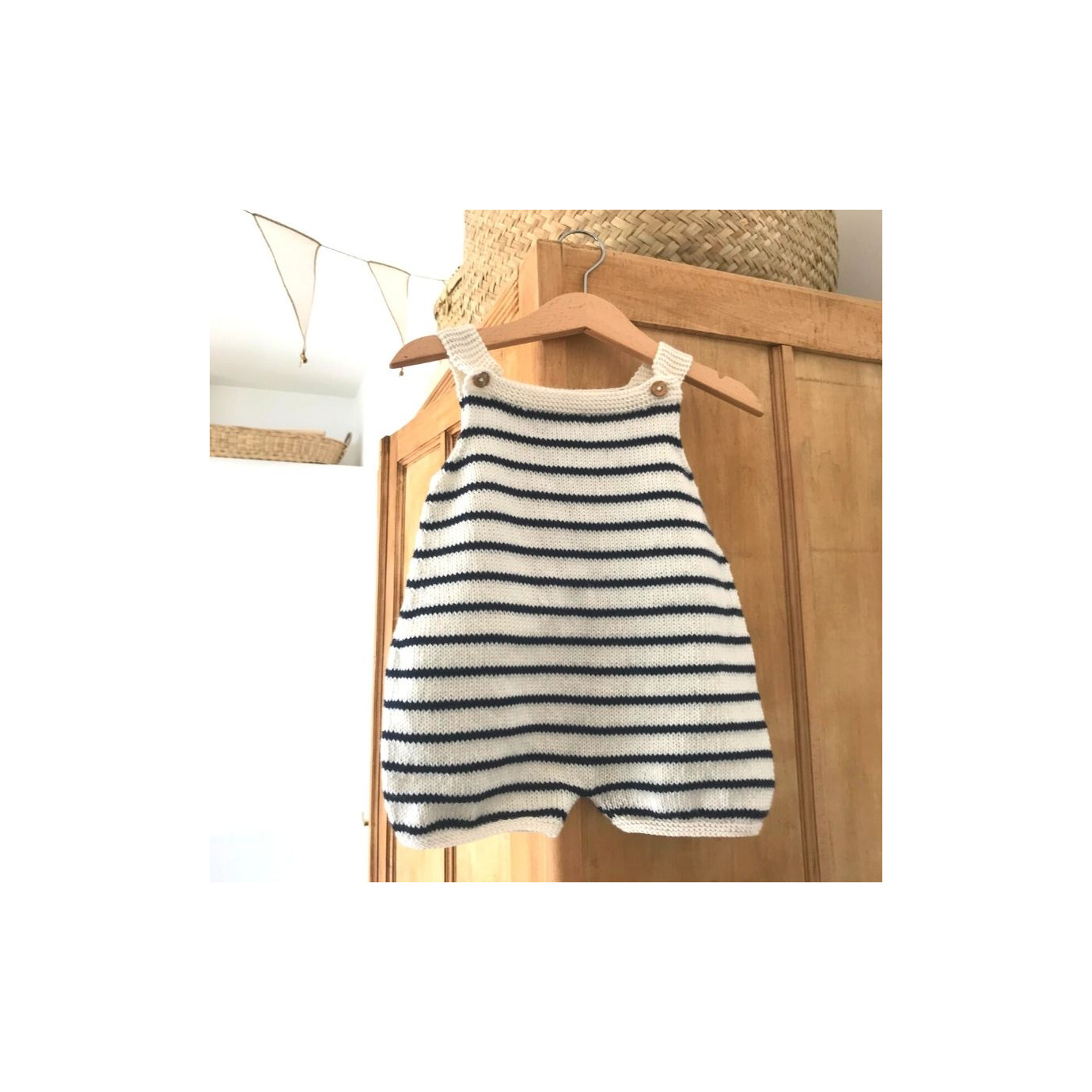 Kit tricot de la salopette Arthur pour bébé. Tricoté au point jersey double face et point de côtes à m. glissée