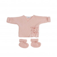 Chaussons pour bébé, coloris rose, tricotés au point mousse en laine naturelle 100% mérinos pour garder au chaud les pieds du nouveau-né.