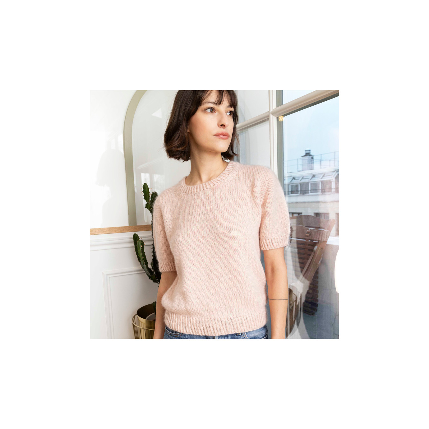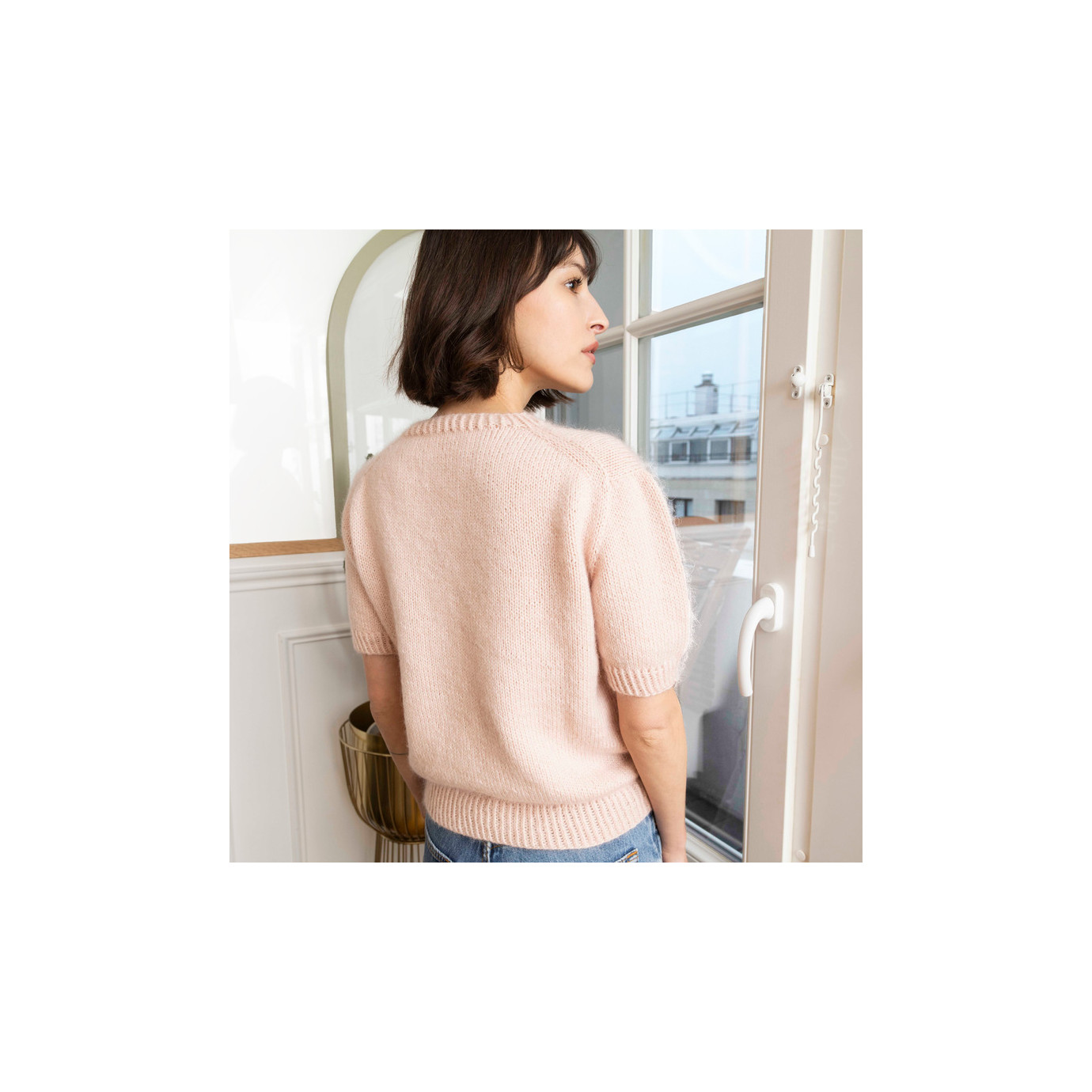 Le pull Aglaé est un pull à manches courtes qui est relativement près du corps et court. Les épaules sont de forme dite « européenne » et le col est ras du cou. Il est construit en top down.