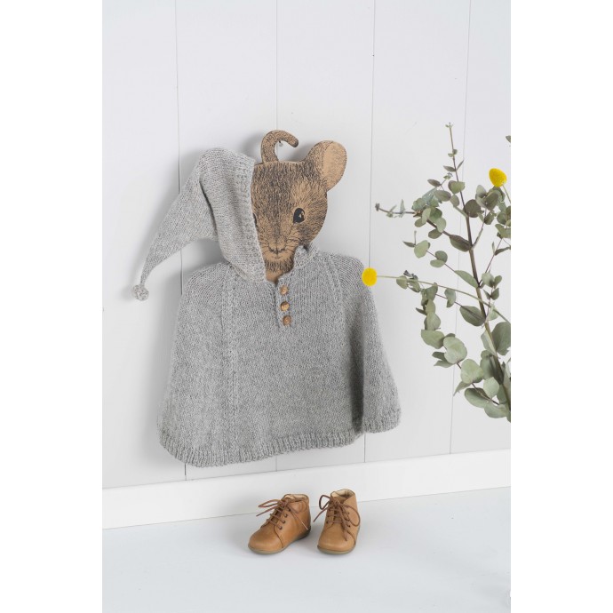 Modèle PDF tricot du poncho Bruno. Trois petits boutons en bois d'olivier au niveau du col et un pompon au bout de la capuche.