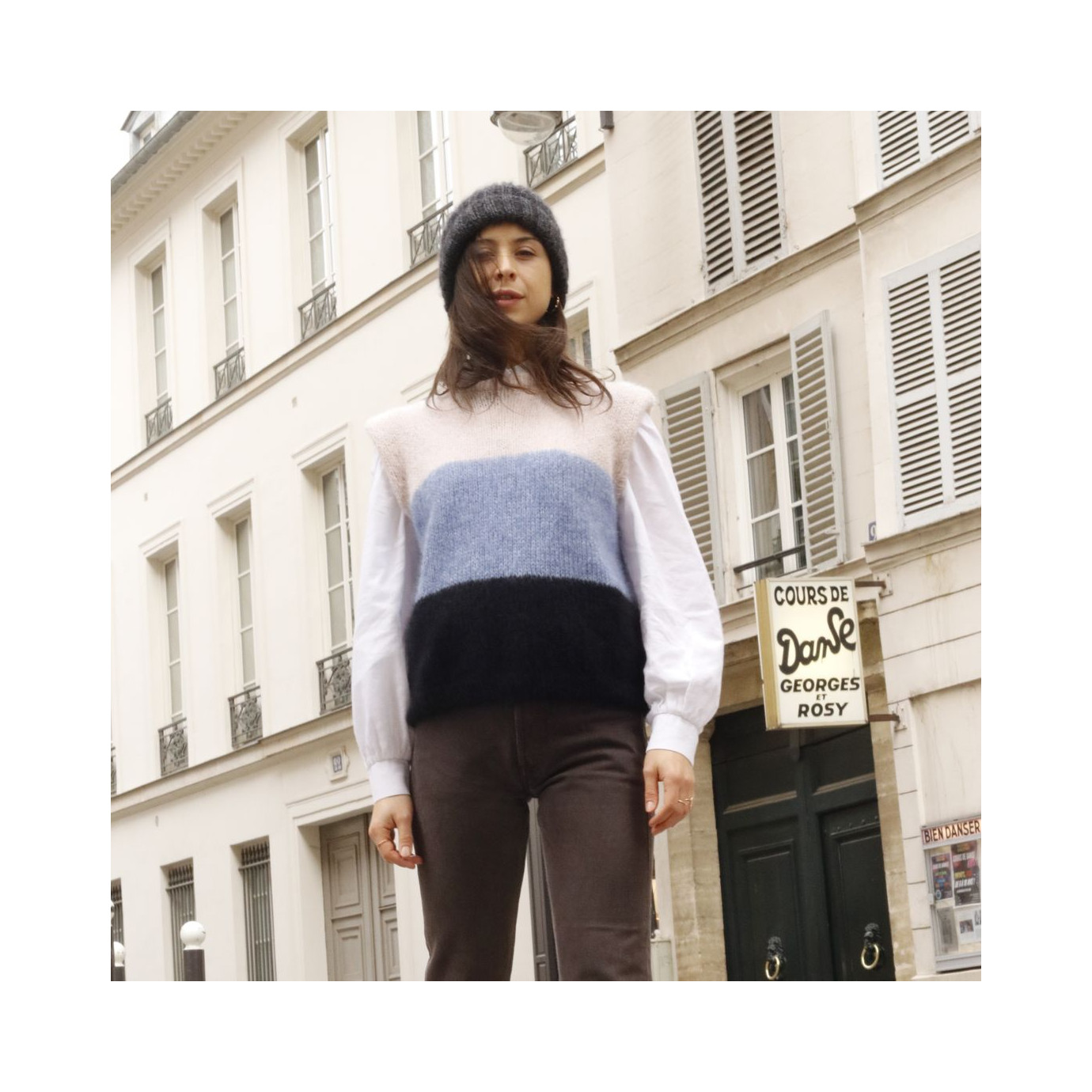 Taille : XS (S/M/L/XL) - 2 (3/3/4/4) pelotes Merveilleuse coloris Noir et (2/3/3/4) pelotes coloris Bleu Ocean et 3 (3/4/4/5) pelotes coloris Beige