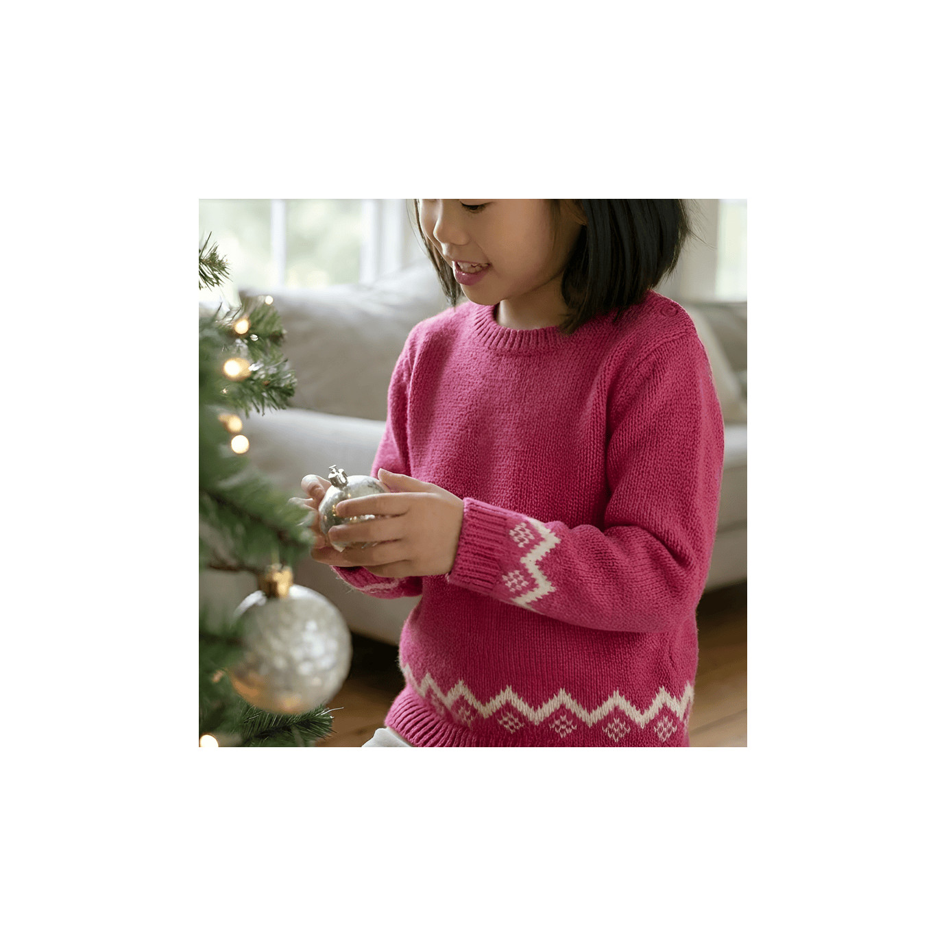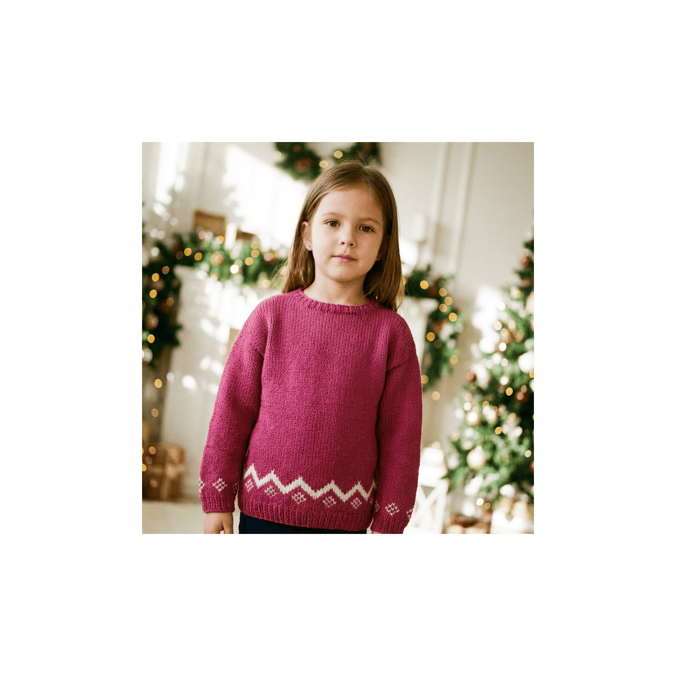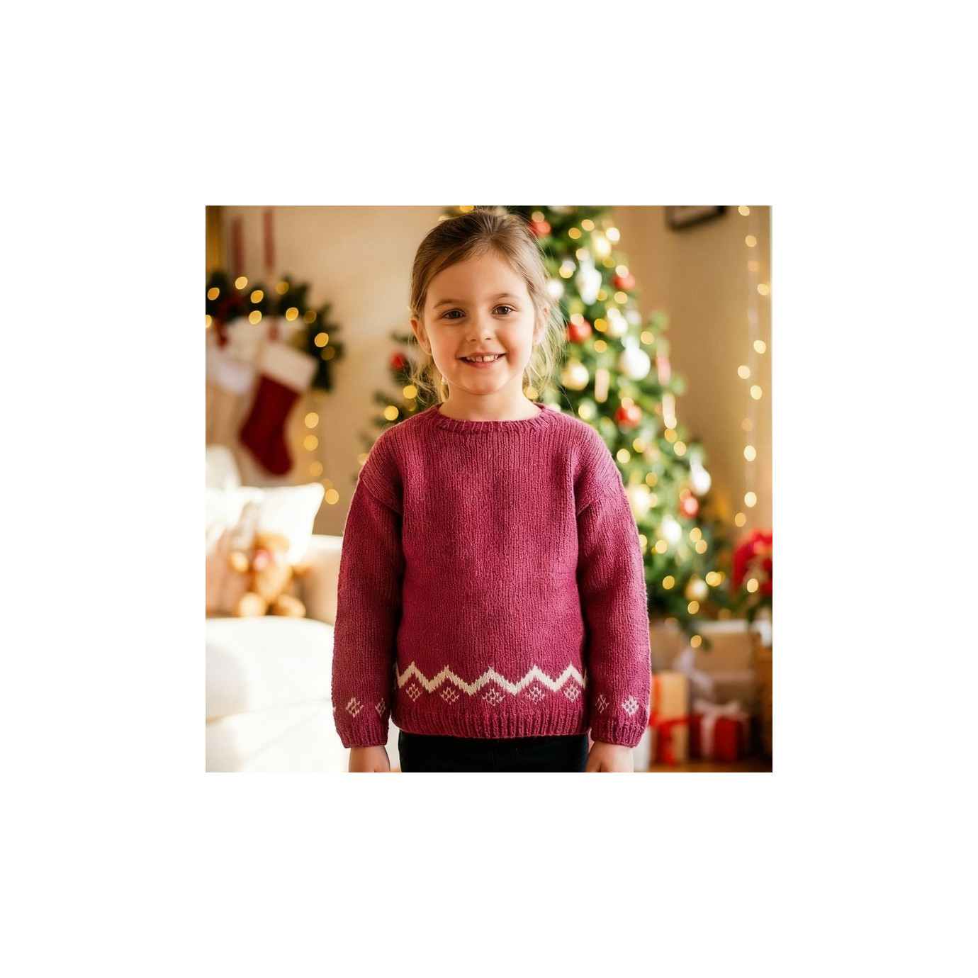 Modèle tricot du Pull Lucie, au point de cotes en point de sable. Ce pull tricote en 4 morceaux et il comporte une bande jacquard en bas du corps.
