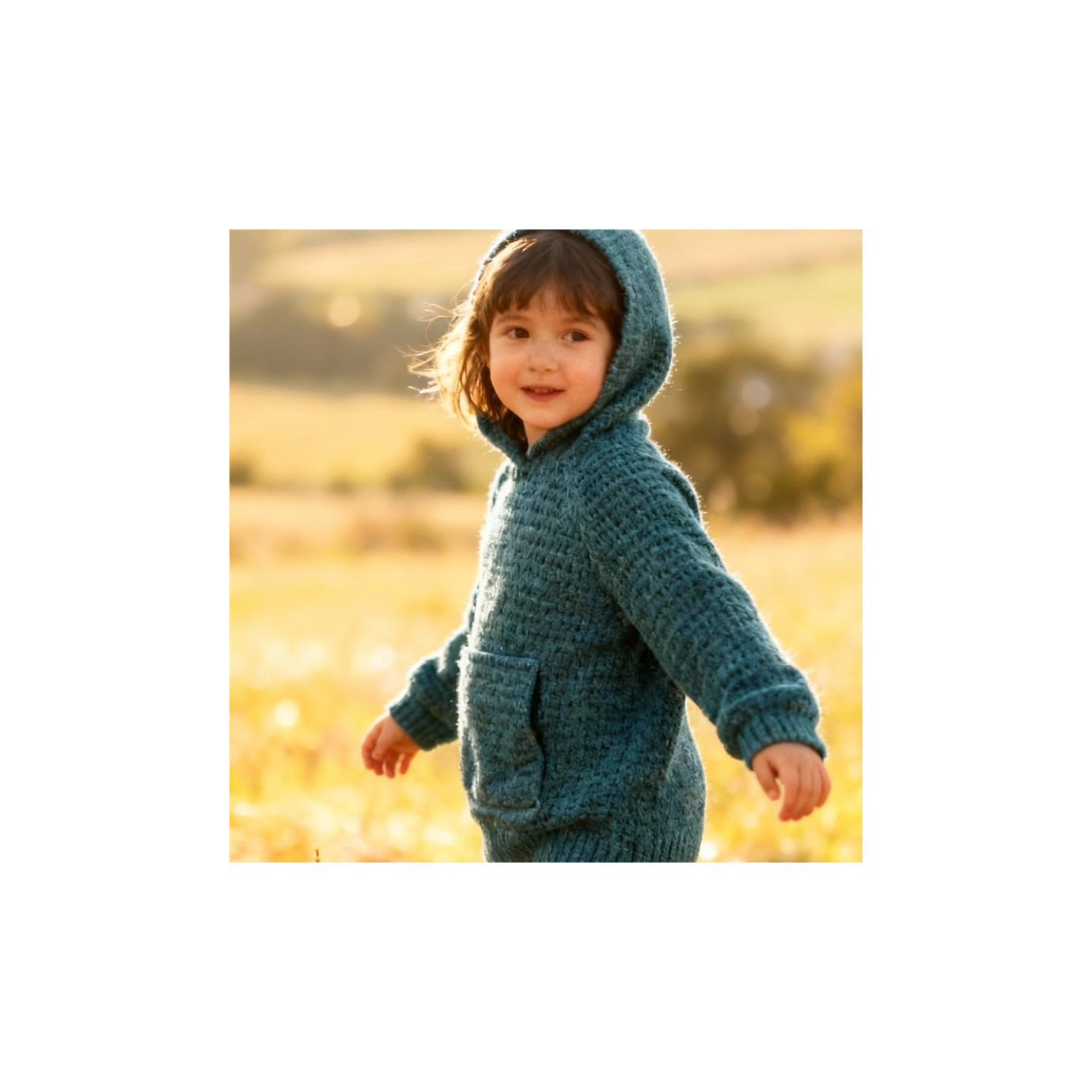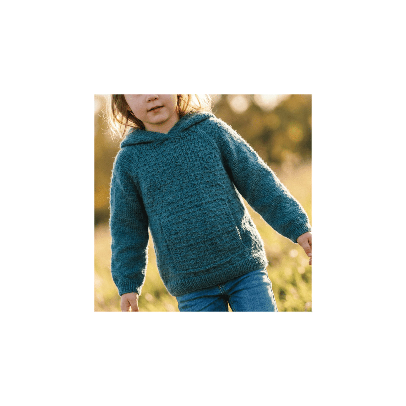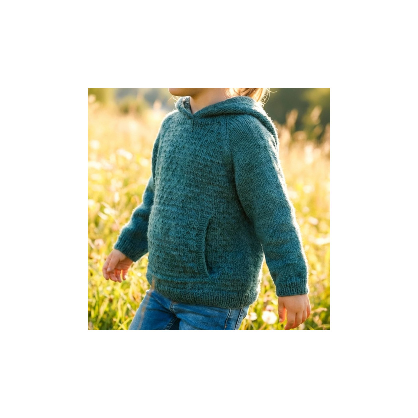 Ce sweat est tricoté de bas en haut, d’abord en 4 parties en aller/retour, puis en rond pour l’empiècement raglan. Une capuche est ajoutée à la fin.