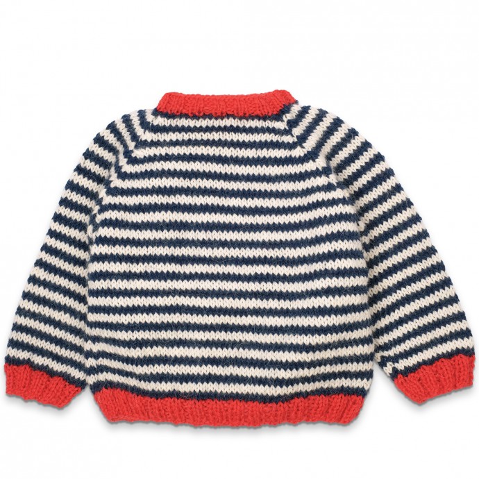 Modèle PDF tricot du pull Hubert pour bébé, pour garçon : coloris rayé marine et écru, au point de jersey endroit, avec bords en côtes rouges.
