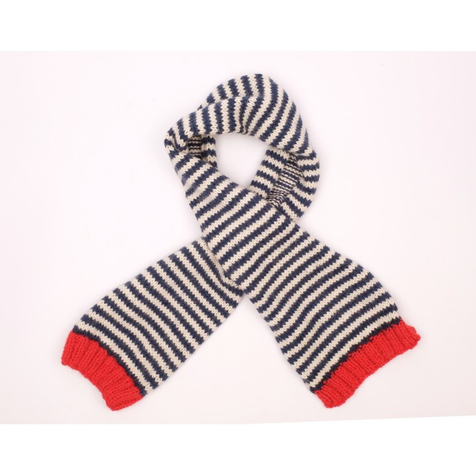 Modèle PDF tricot de l'echarpe Hubert, écharpe rayée bleu marine et écrue avec côtes rouges aux extrémités.