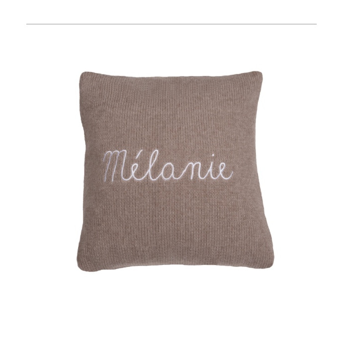 Coffret coussin + grande couverture (100x70cm) personnalisables pour bébé CHATAIGNE en 100% mérinos qui rendent ces articles doux et souples.